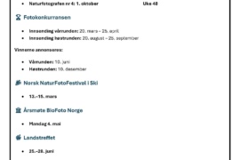 Det blir også bilder fra noen av medlemsturene våre – Flatanger og Halten – og vi letter litt på sløret om neste års Midt-Norske NaturFotodager. Som vanlig blir det en god og sosial pause midt i møtet, med enkel servering.
