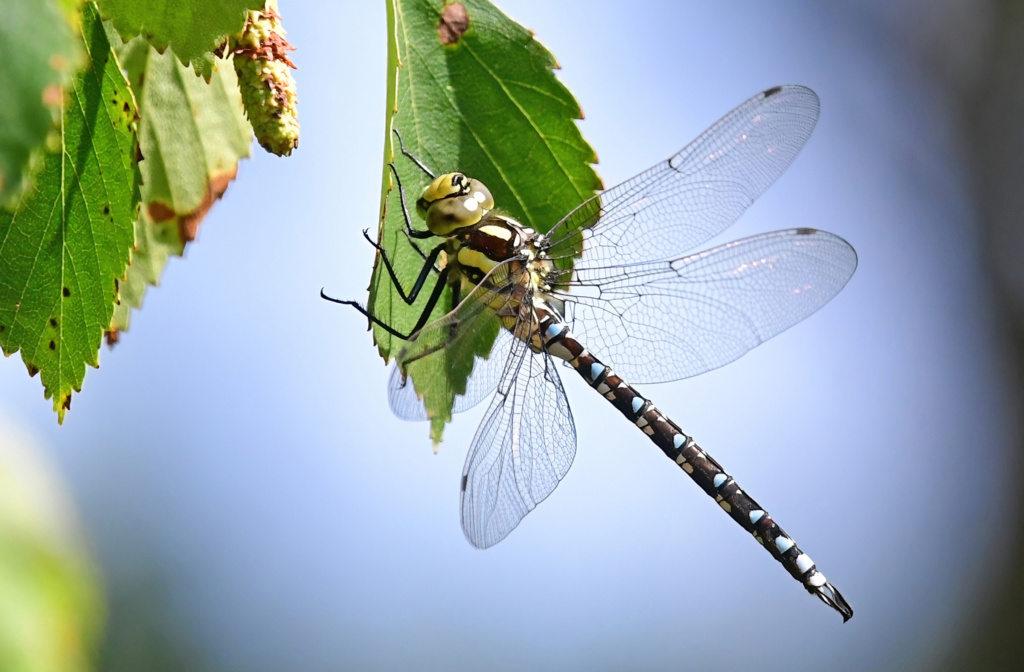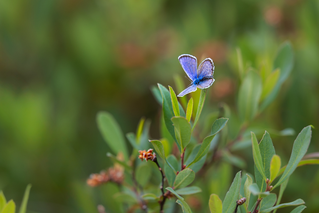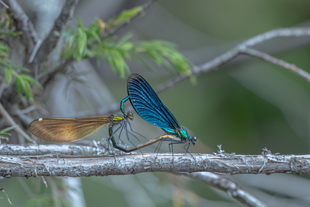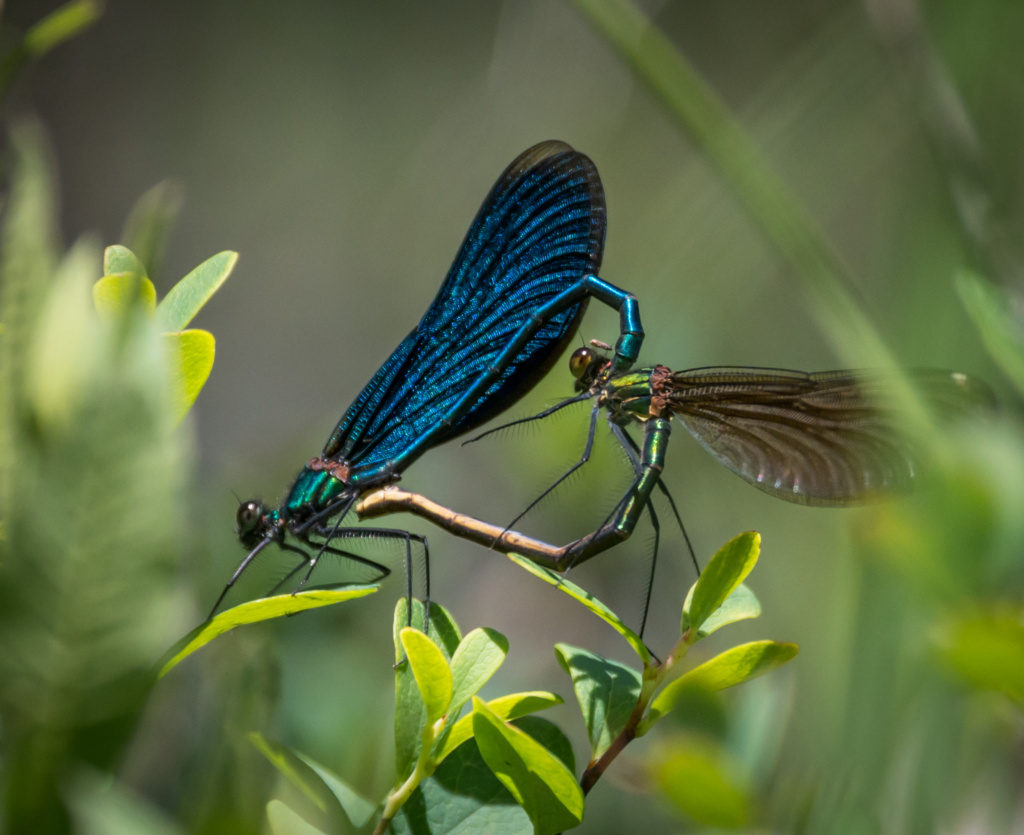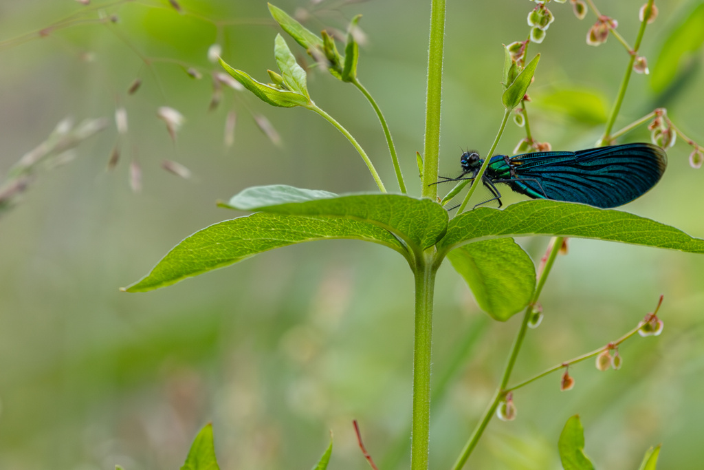 Møt Calypteryx virgo. Med sine metallisk skinnende vinger og sommerfuglaktige flukt, er blåpraktvannfymfene en favoritt blant mange av oss som liker å fotografere småkryp.