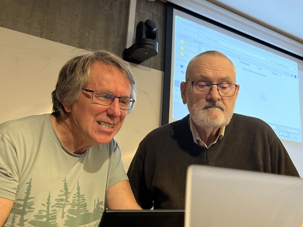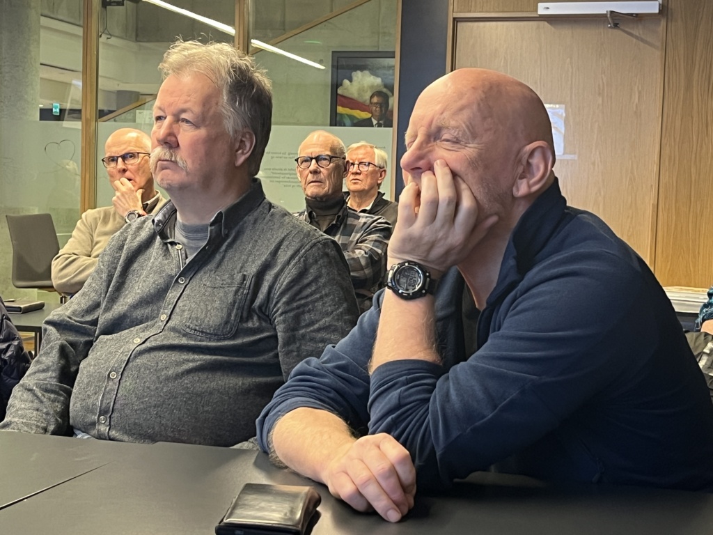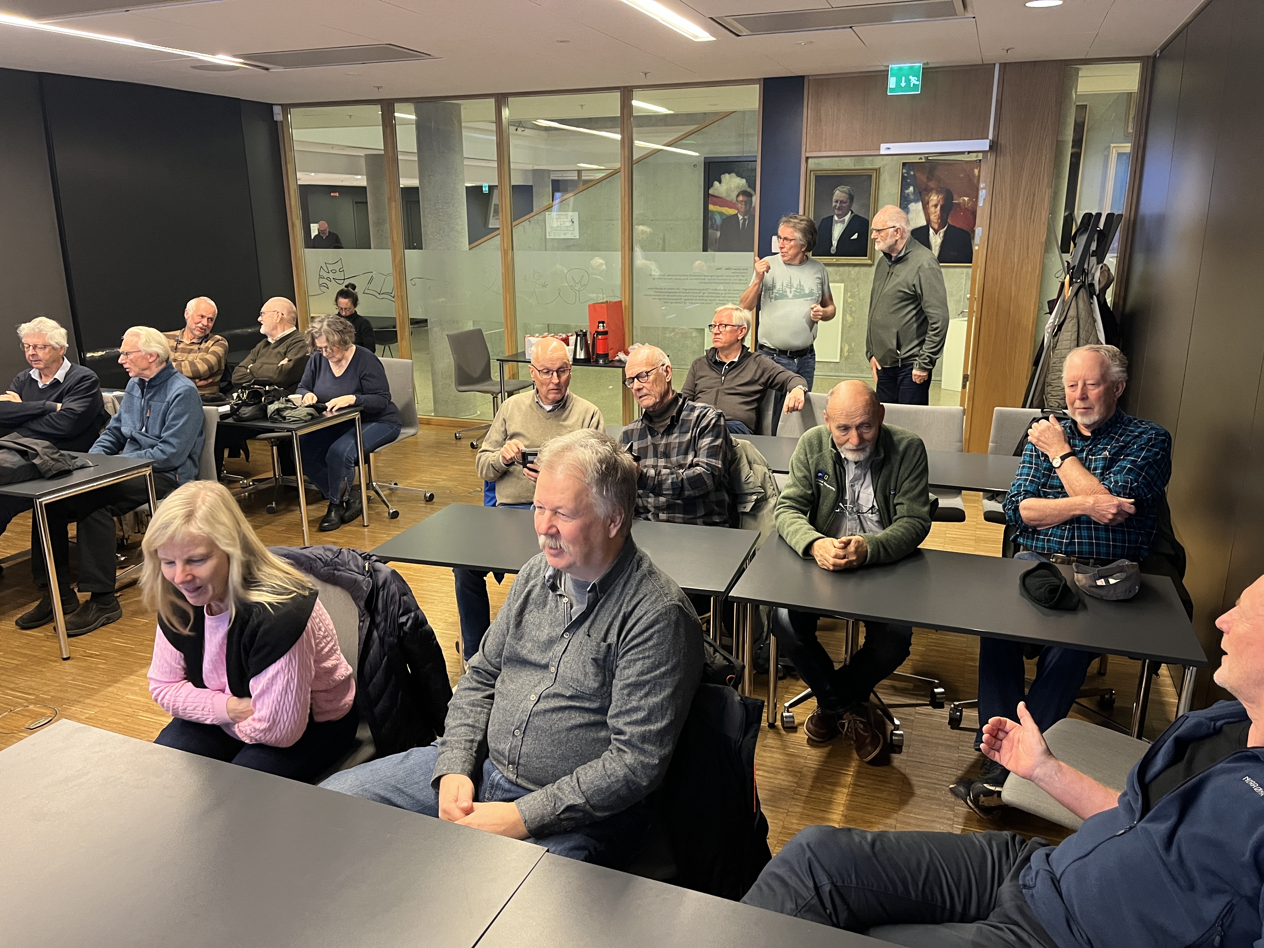 Det er klart for årets siste møte. Bak leder Terje i prat med foredragsholder Bjørn. Foto: Tarald Reinholt Aas
