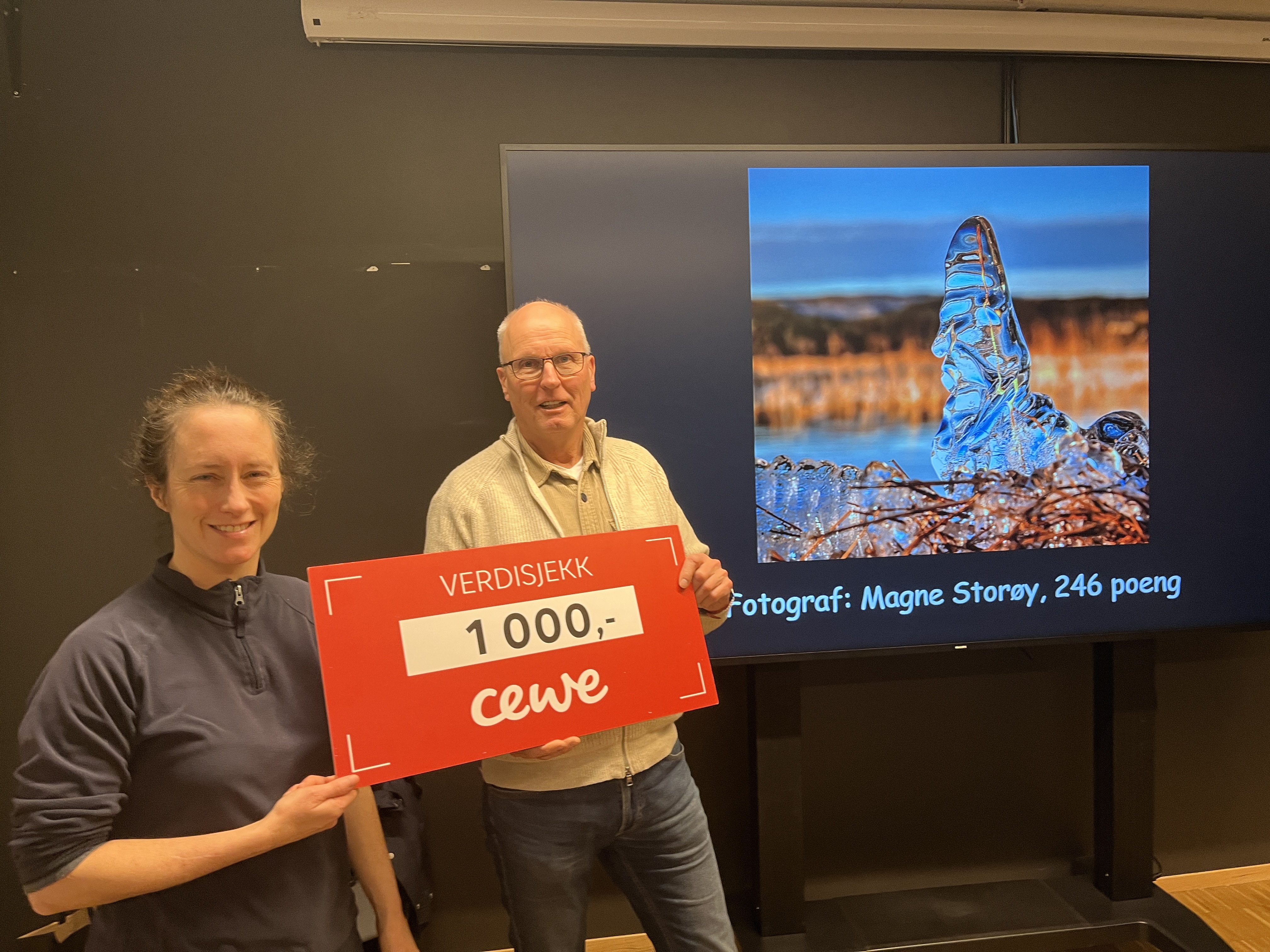 Hilde Skiffard med gavesjekken til Magne Storøy. Vinnerbildet bak. Foto: Tarald Reinholt Aas