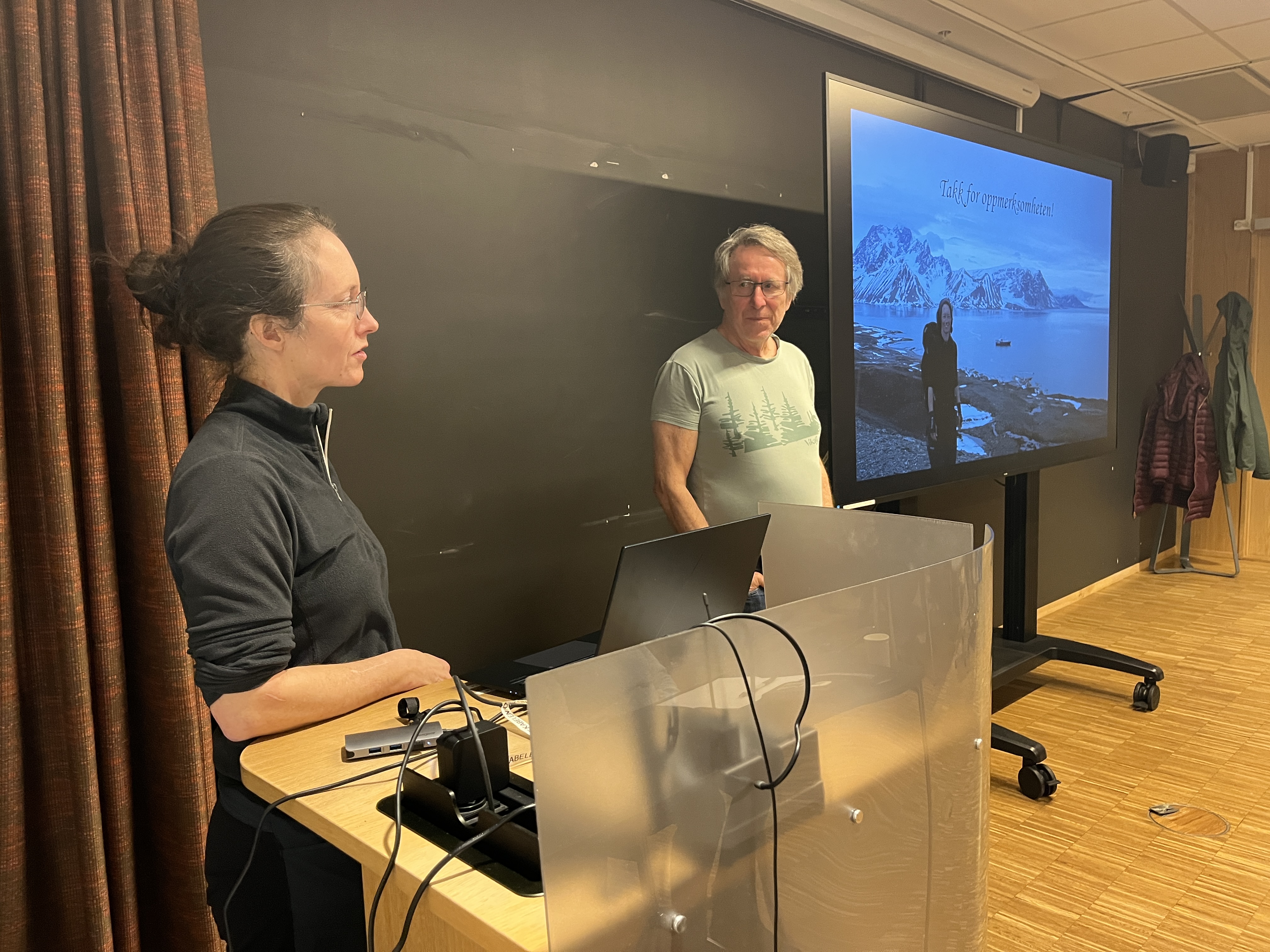 Terje takker varamedlem Evy for innsatsen i styret. I bakgrunnen er foredragsholder Hilde på plass på lerretet. Foto: Tarald Reinholt Aas