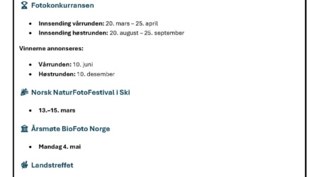 Under kommer viktige datoer for BioFoto 2026, så medlemmene våre lettere kan ha oversikt over alt som skjer ...