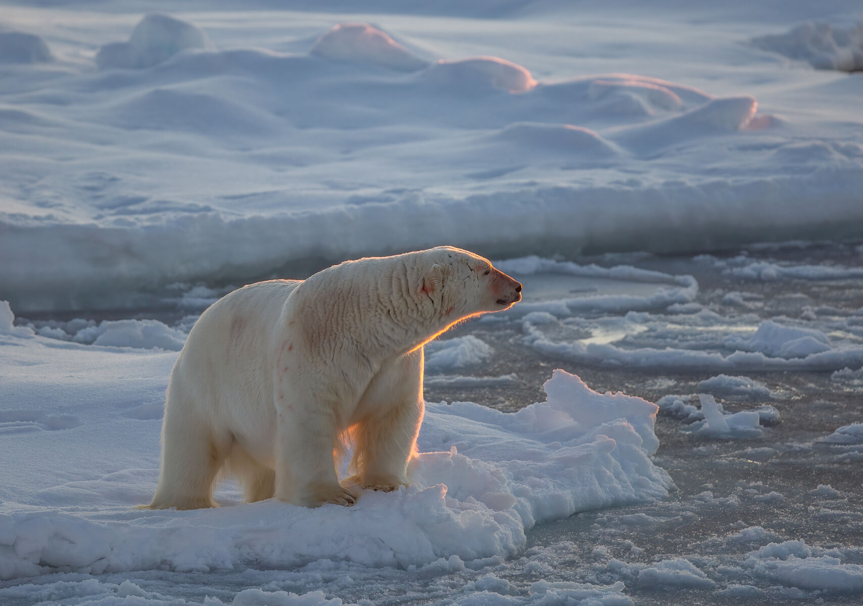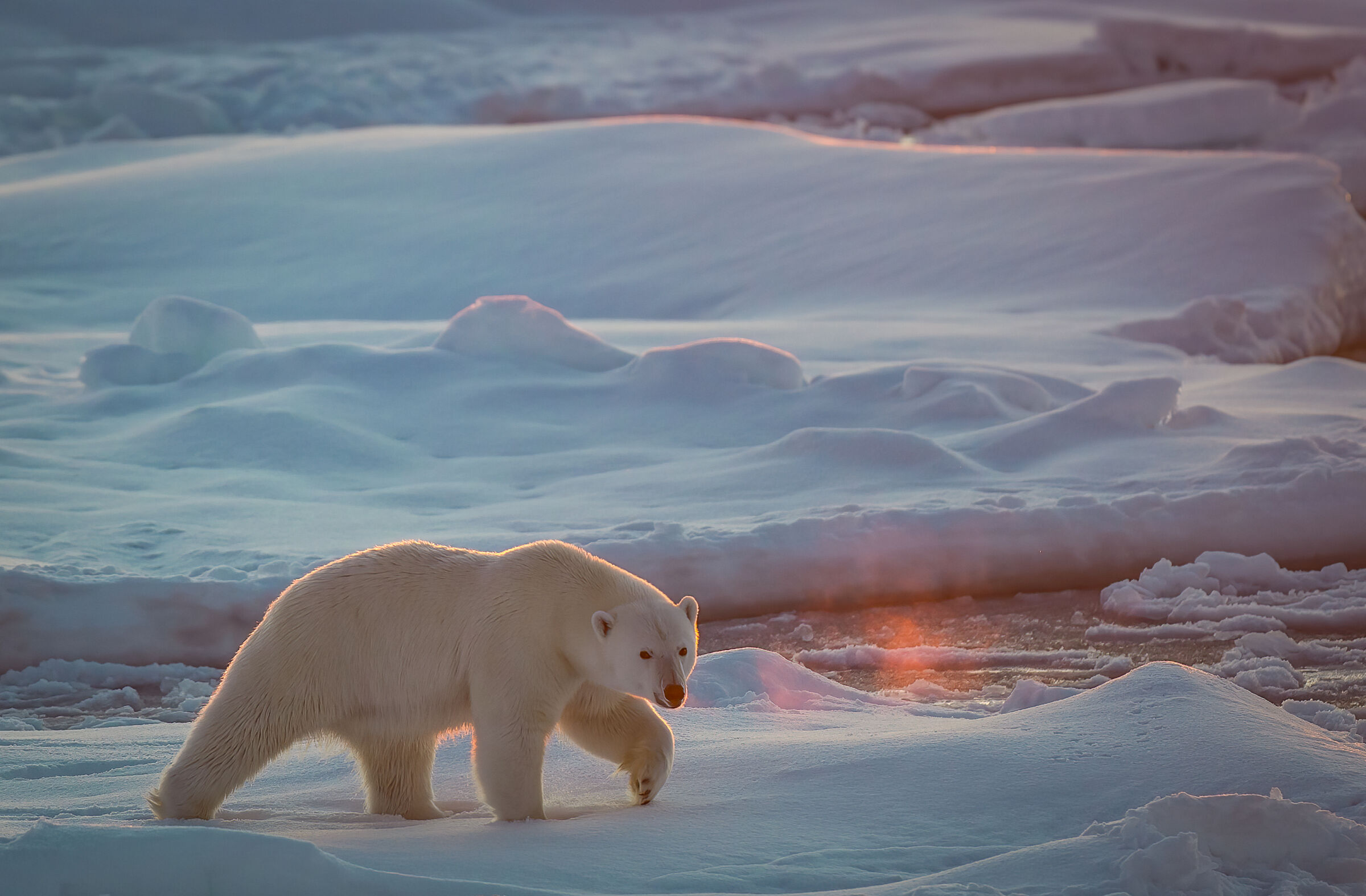 "Mett isbjørn i solnedgang" med fine tekniske kvaliteter og god komposisjon. Veldig bra. Å vurdere bilder uten tekst og kjnneskap til historien er ofte en utfordring, men jeg har inntrykk av at bildet er tatt fra båt. Et bilde med vinkel mer på nivå med isbjørnen ville bragt oss enda sterkere inn i Isbjørnens verden. Hva ser den? Hva tenker den?