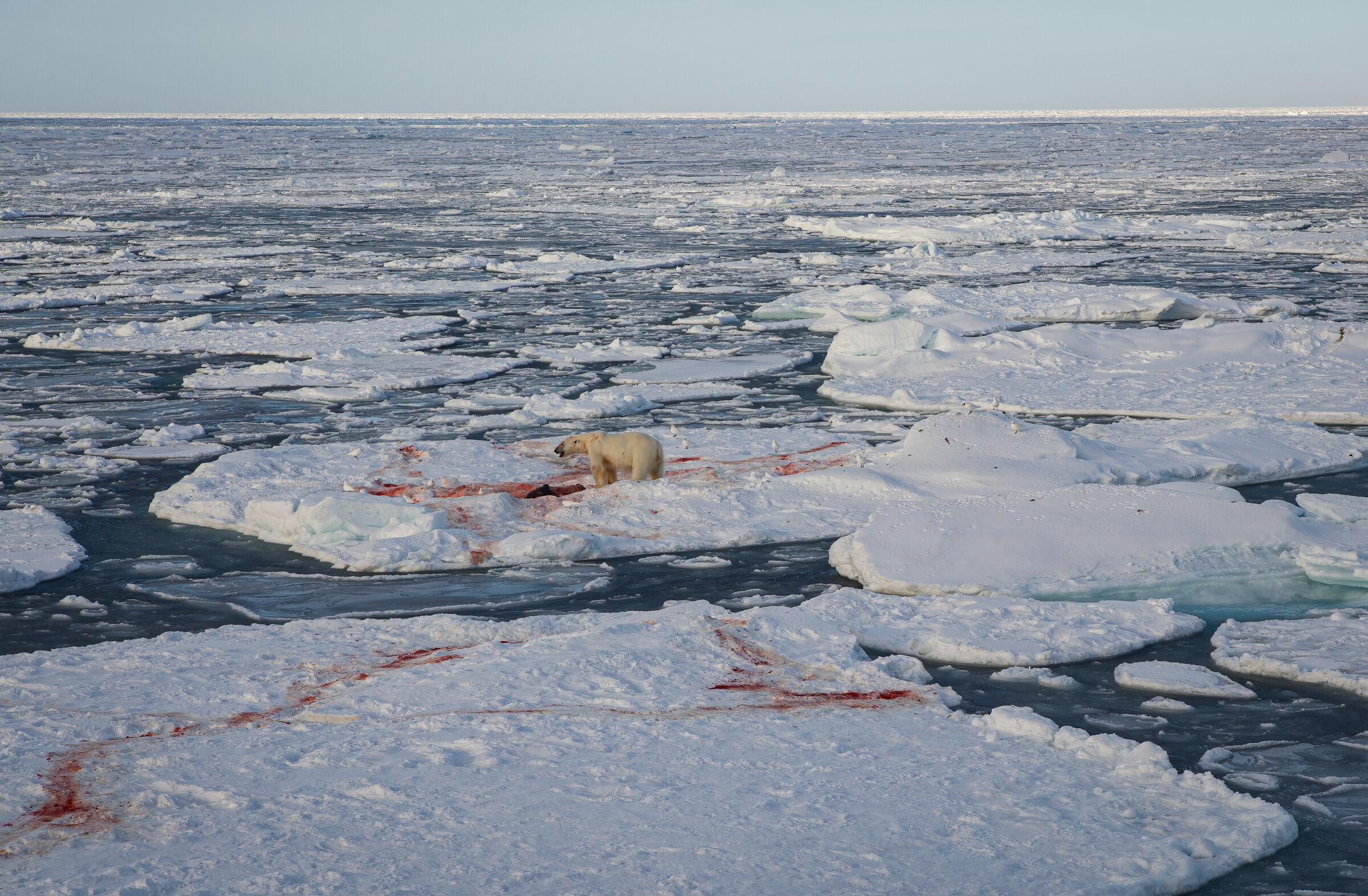 Blodsporet igjen men her er ikke storyen like sterk der sporet leder langt inn i bildet. Ville ha zoomet inn her og kuttet ut himmelen. Bare blodsporet i forgrunnen og til bjørnen med masse is rundt ville ha fungert bedre.