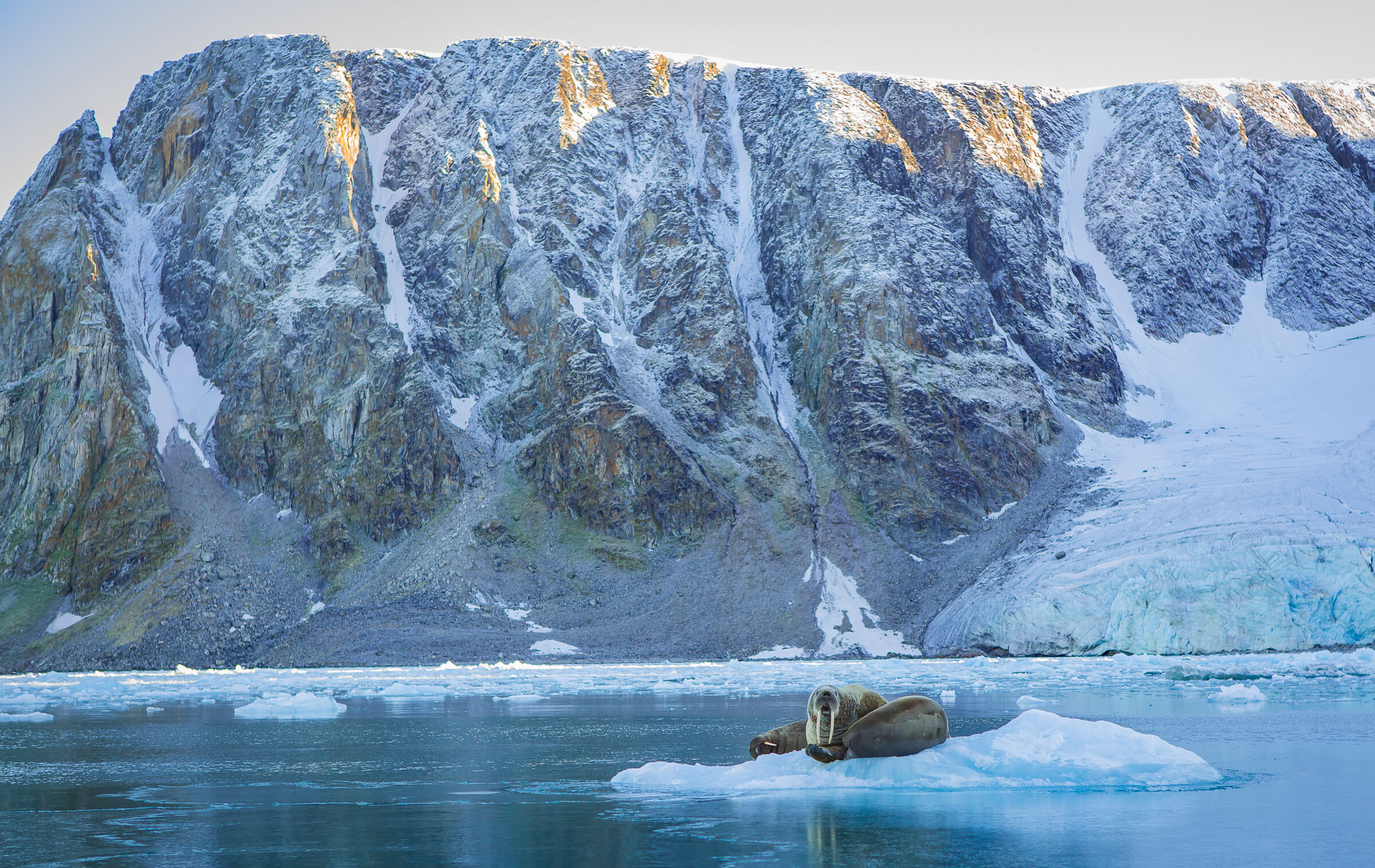Flott lys. Trangt i toppen i bildet. Hvalrossene plassert bra i landskapet. God teknisk kvalitet. Kanskje en ørliten skjevhet i horisont. Havet renner ut til venstre bildekant.