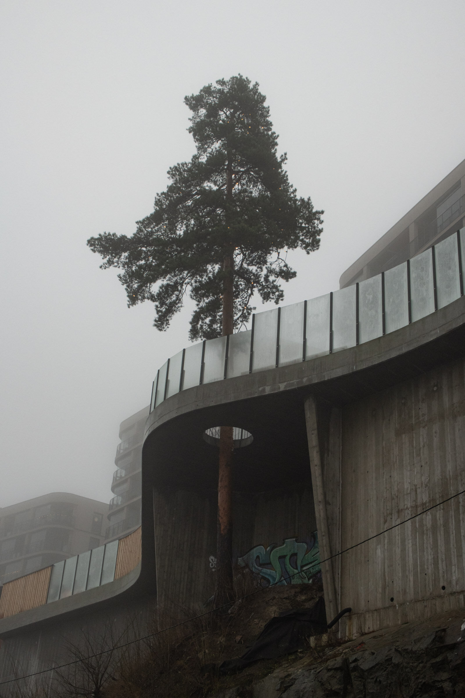 Et uvanlig bilde, der natur og betong møtes. Et sterkt blikkfang av menneskers løsninger som kan gi et håp: at kreativitet og penger brukes på å bevare dette ene treet. Kanskje er det mest en mimikk, en morsomhet fra en ingeniør. Spiller liten rolle; det er et blikkfang som henleder oppmerksomheten på en natur under press, og at vi mennesker bør ta vare på den. Koste hva det koste vil.