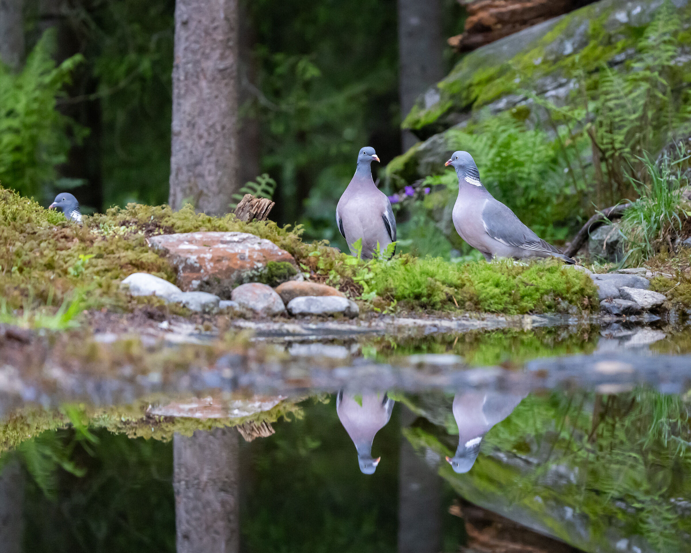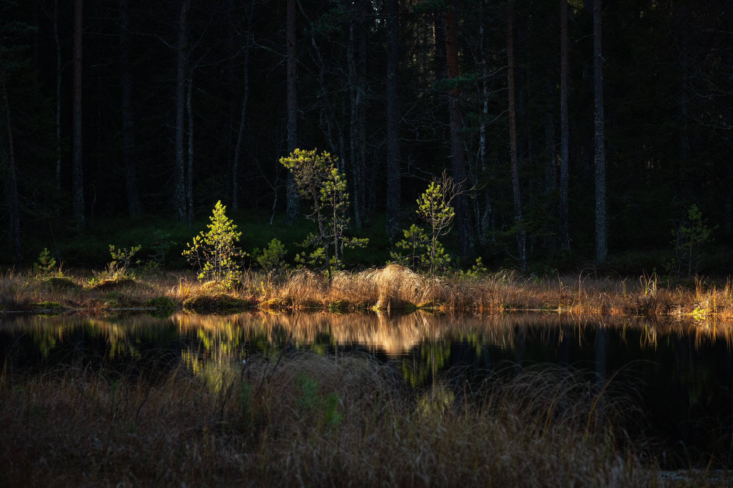 Fint lite landskap hvor trærne i det lukkende skogsrommet speiler seg i vannflaten i den lille pytten. Kajalunden, kanskje? Mener jeg har balansert på den stammen tidligere.