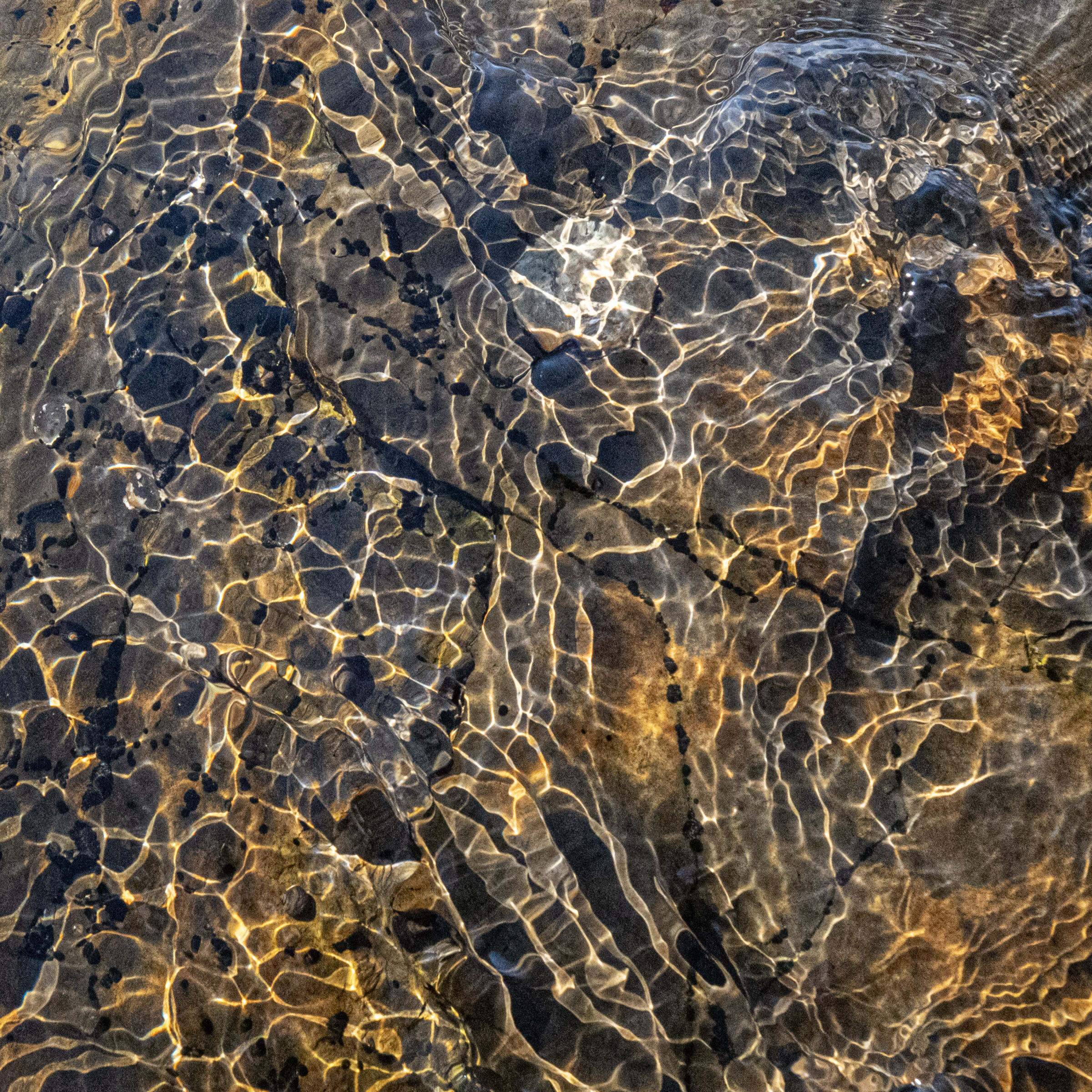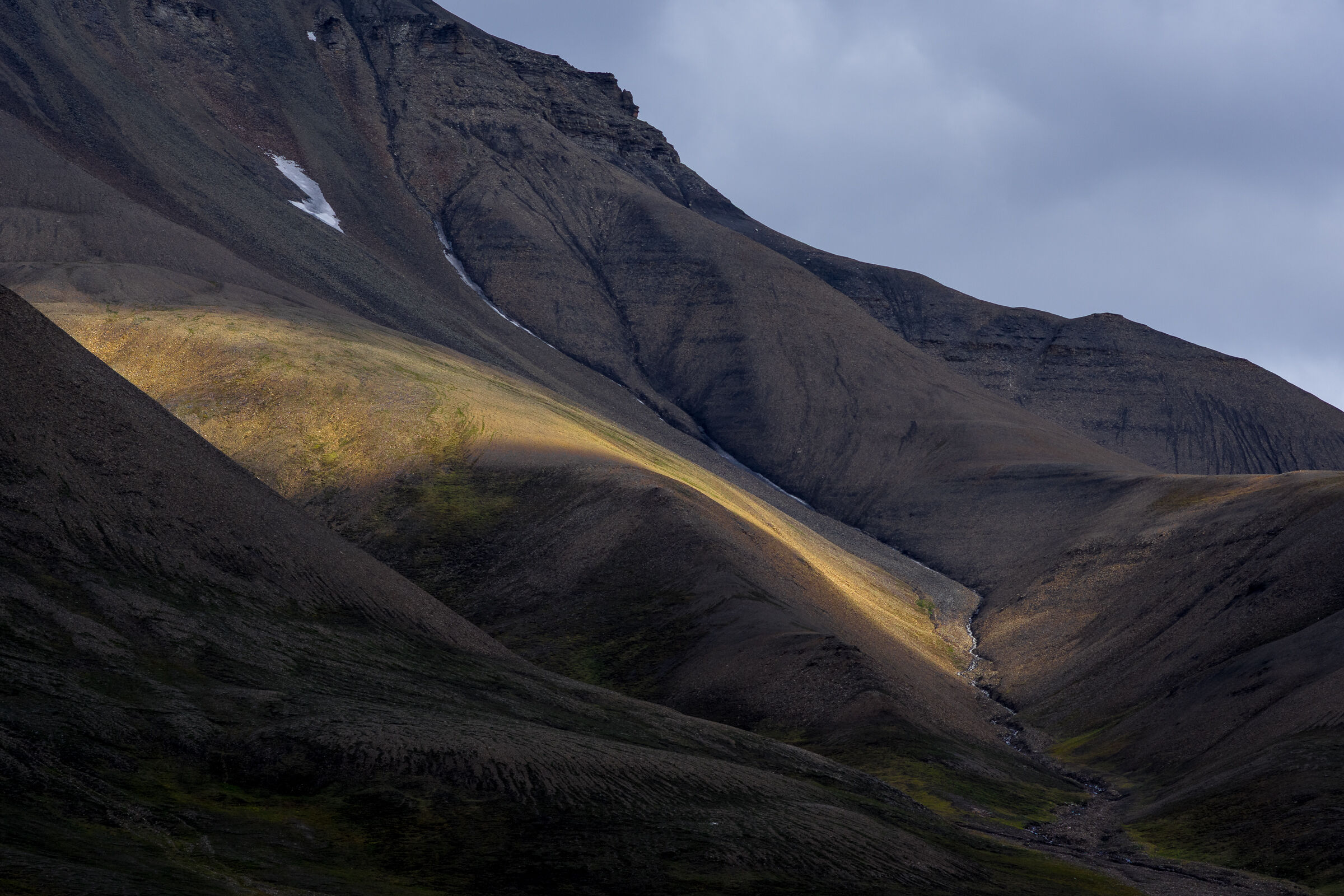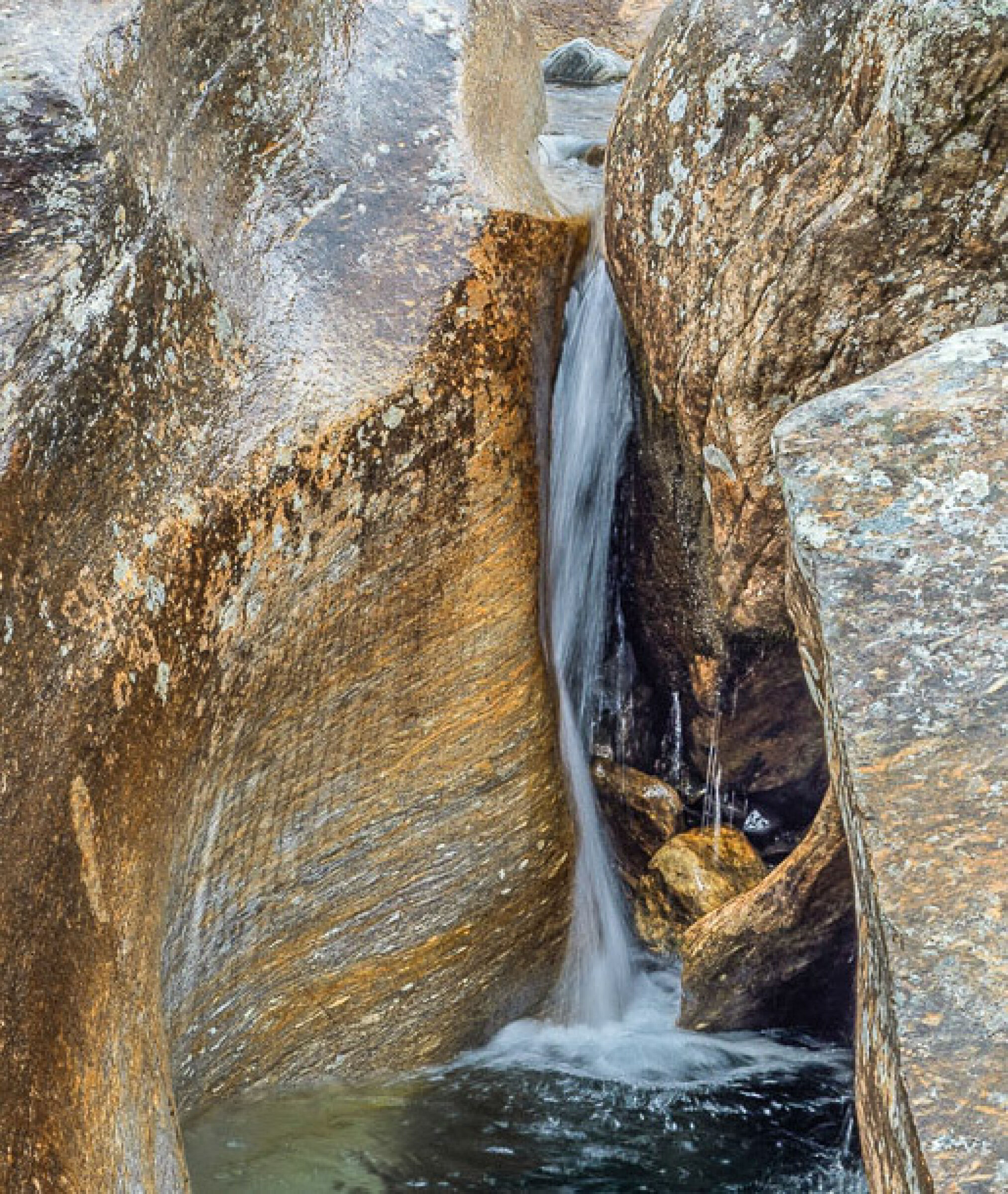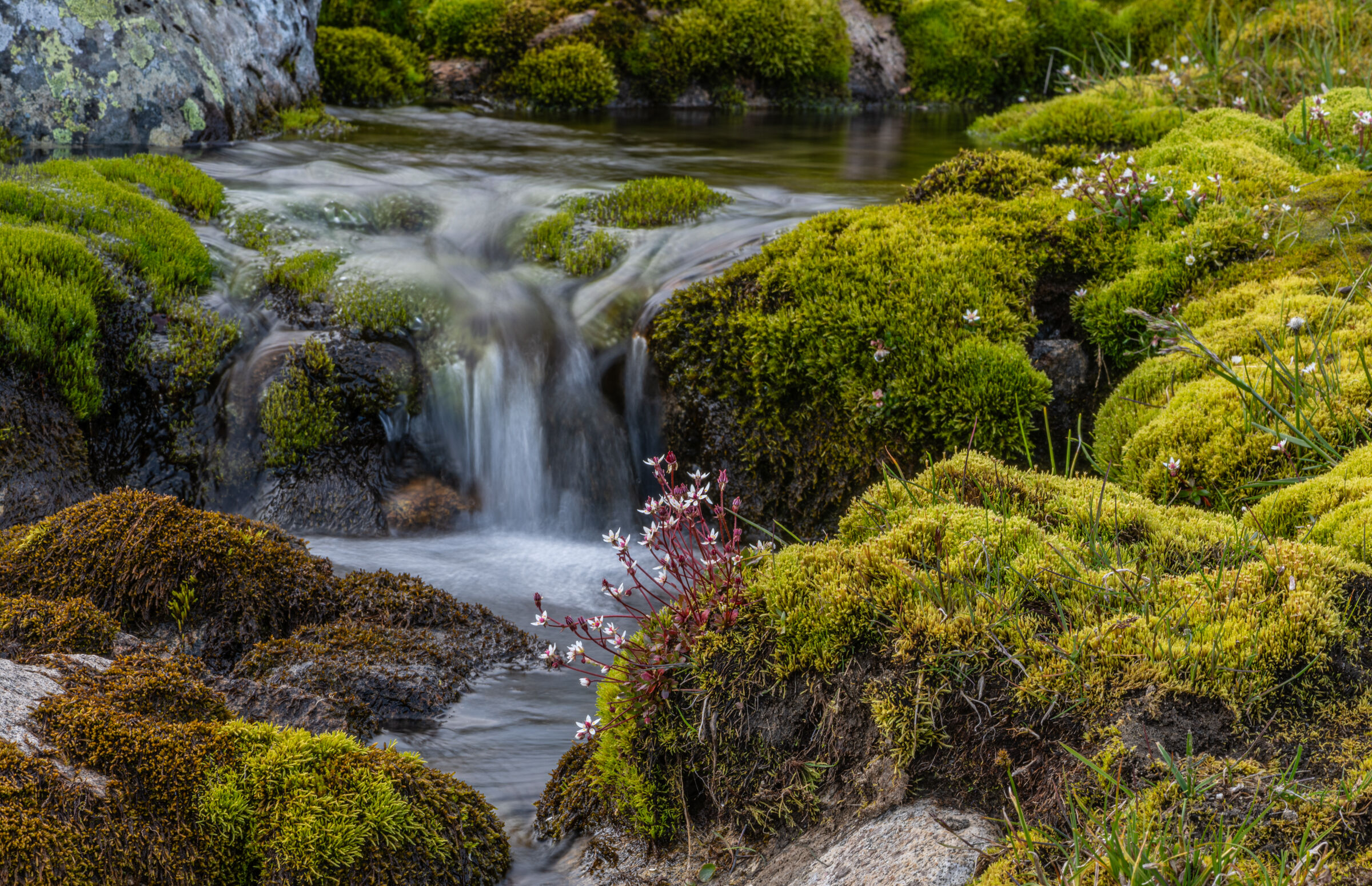 En fin detalj fra en bekkekløft eller fra relativt nytt land nær en brearm. En del lav på berget indikerer at landet ikke er nytt av året ihvertfall. Litt mye reflekser oppe til venstre