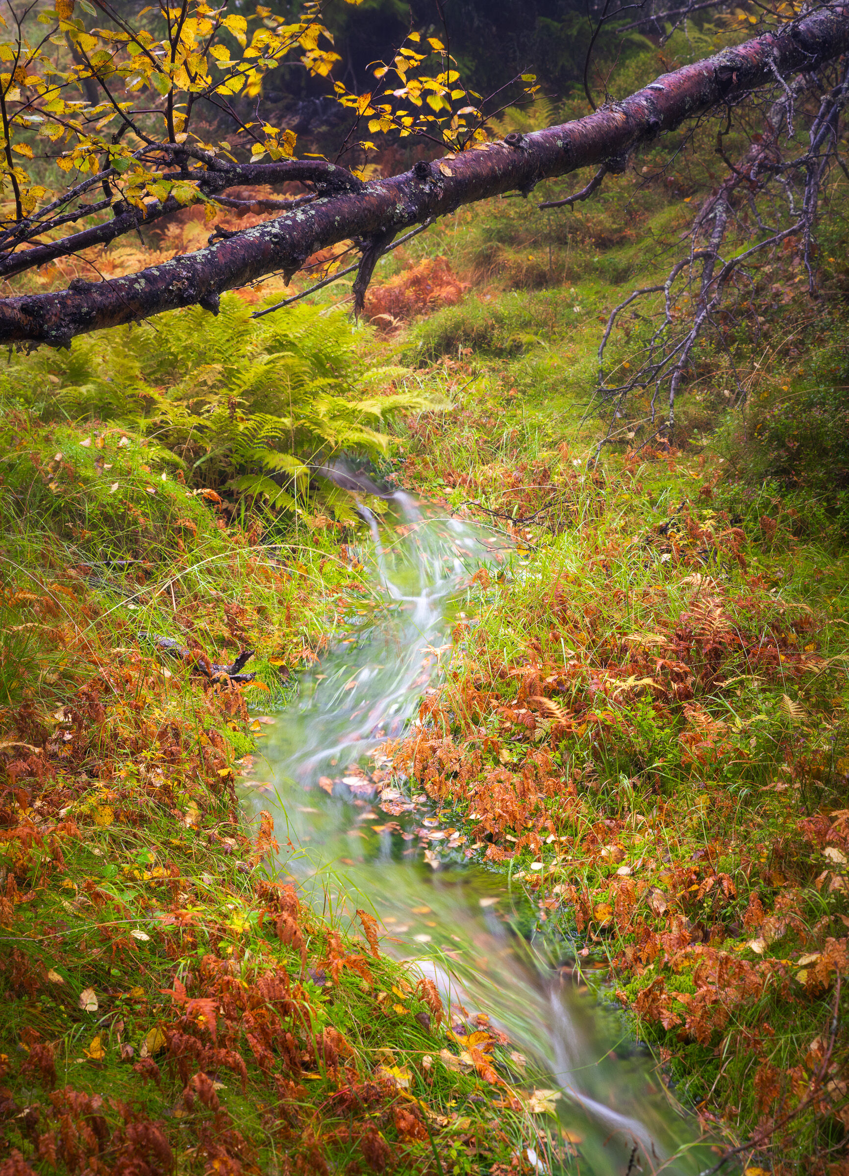 Deilige slike drag i skogen hvor mosedekke plutselig blir en liten bekk. Lurer på om et liggende bilde ville gjort seg bedre, kanskje bjørkestammen da ville tilført bilde en del, nå blir det litt forstyrrende.
