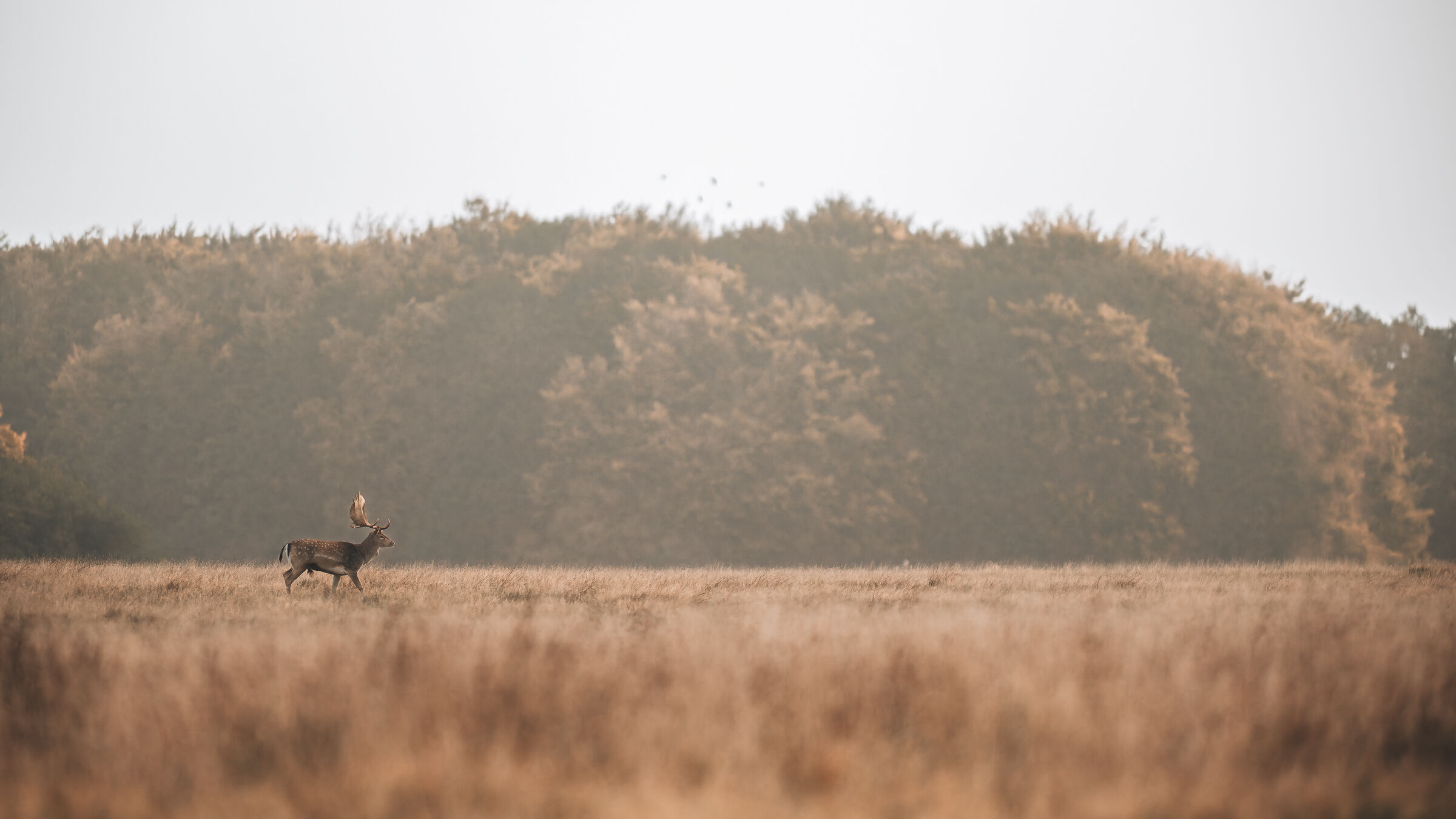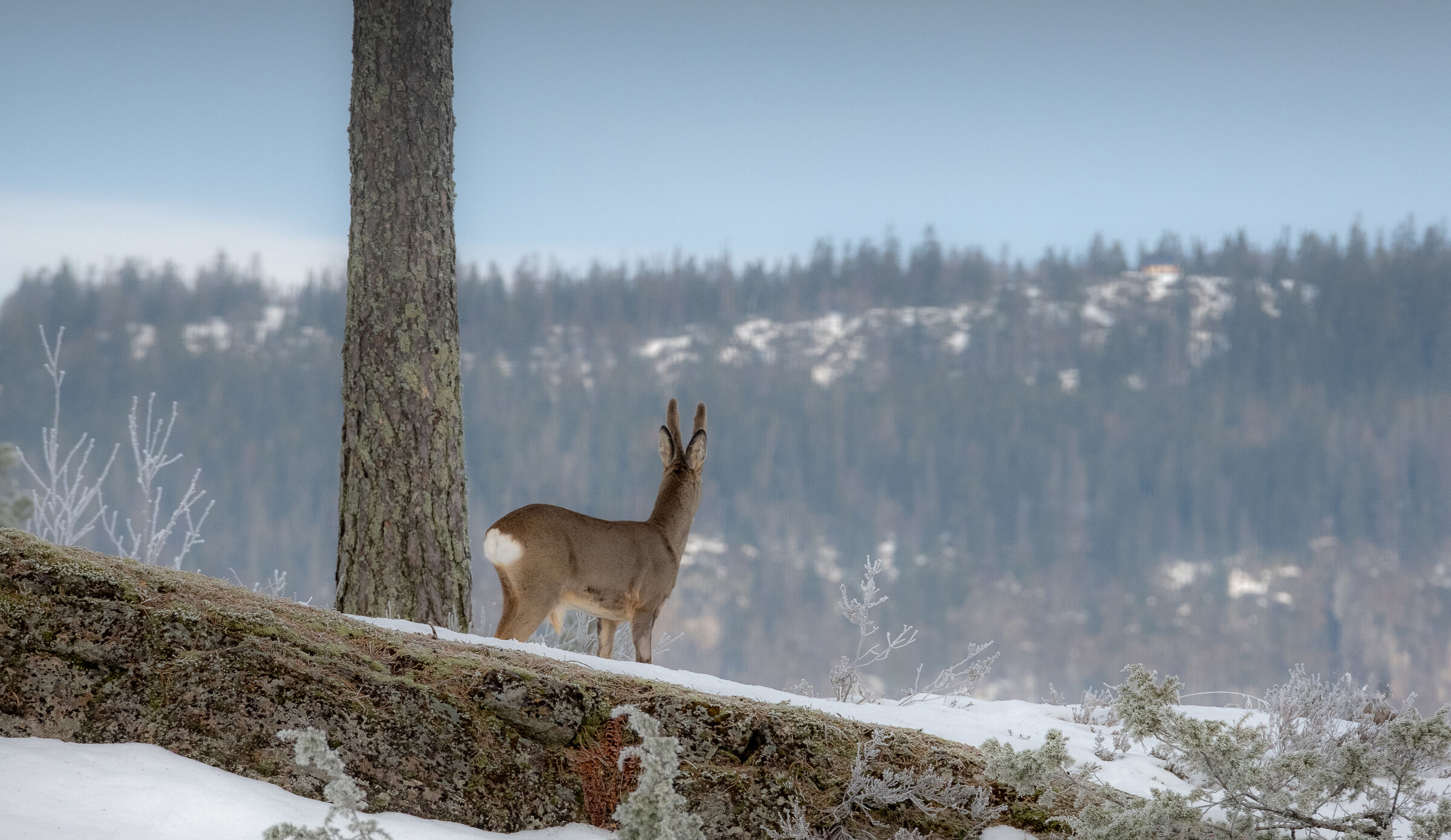Annerledes bilde av rådyrbukken. Bilde skapes av at det står og kikker utover landskapet |