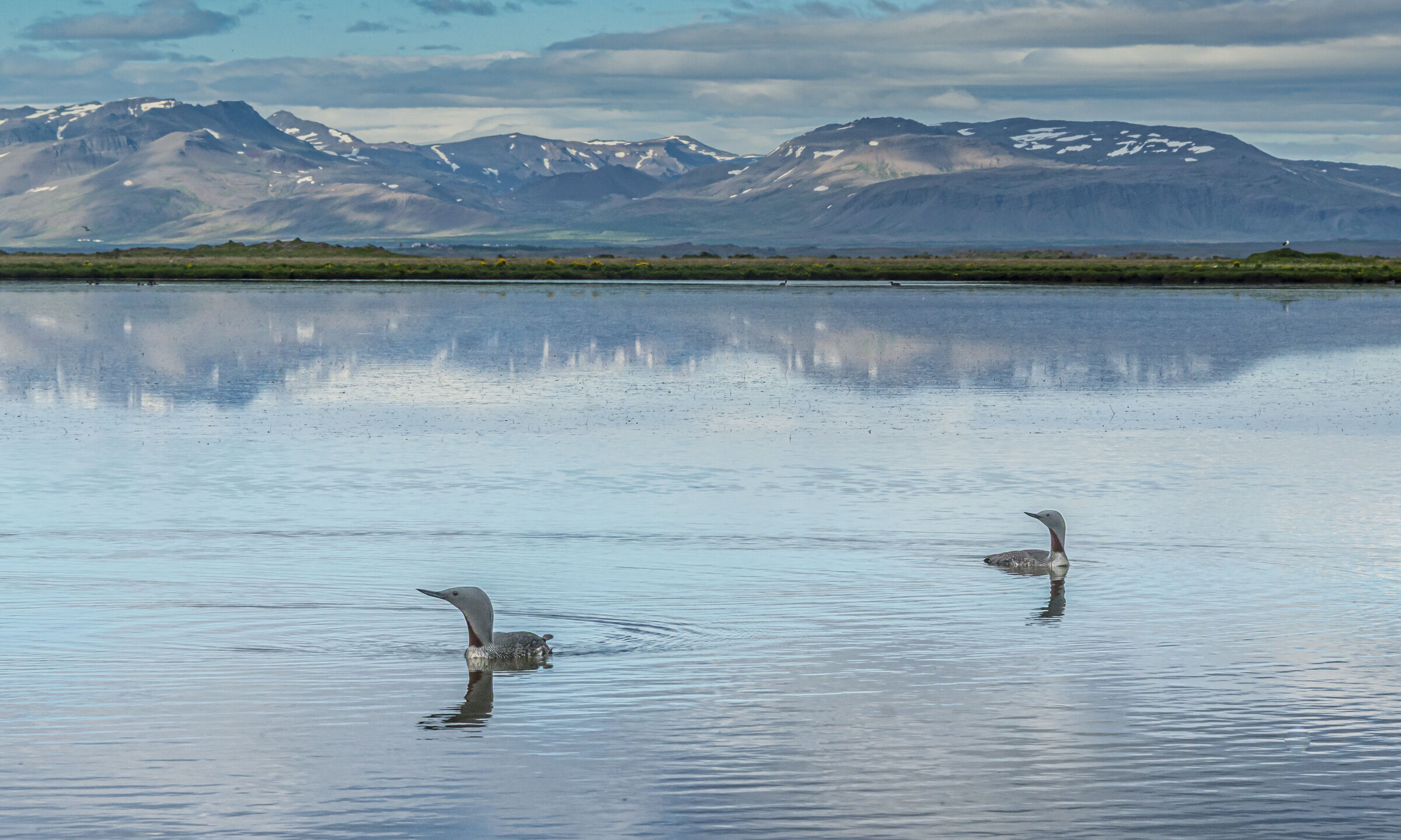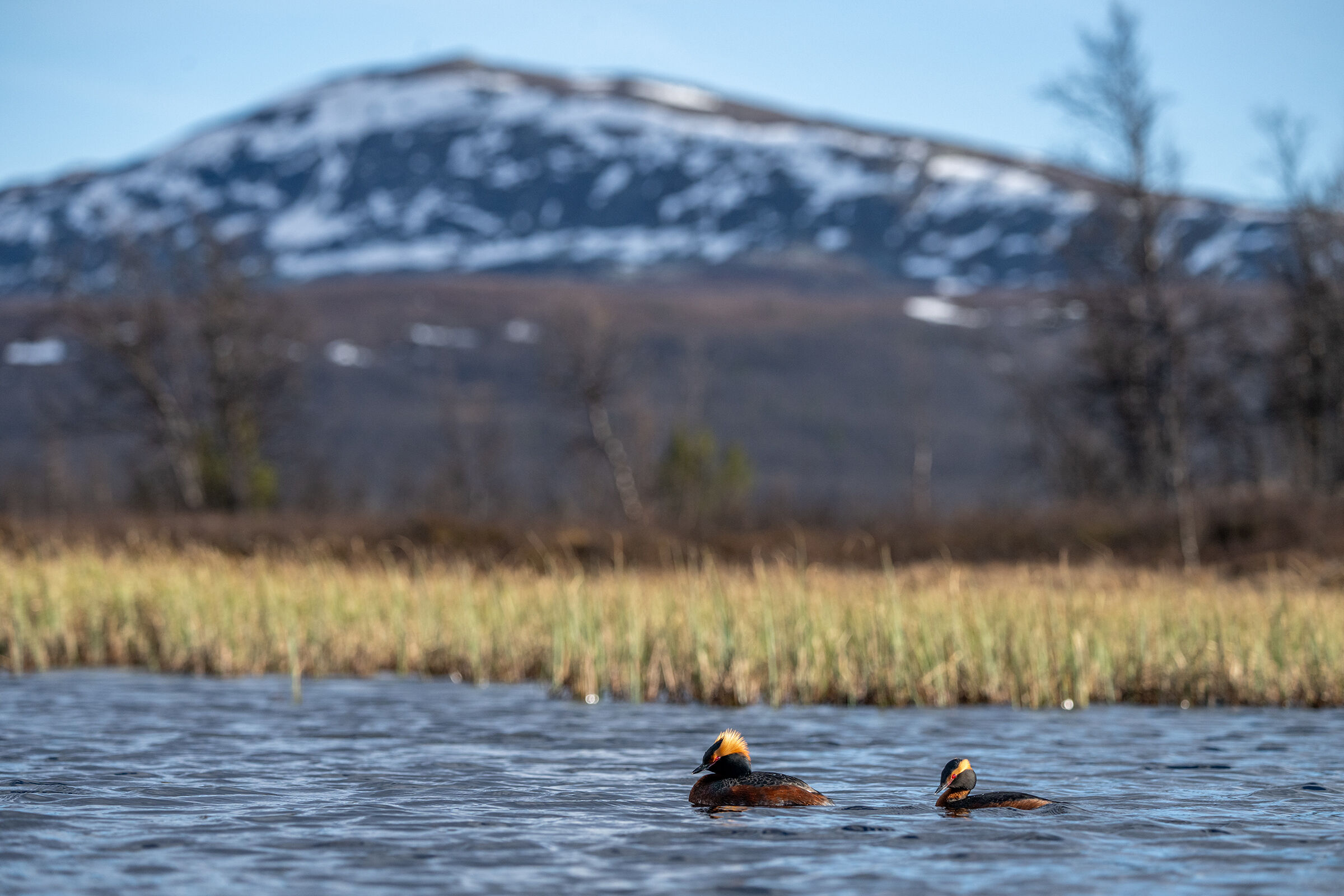 Hederlig , Horndykkerpar med utsikt til fjelltoppene, Nils Olaf Thonvald © |