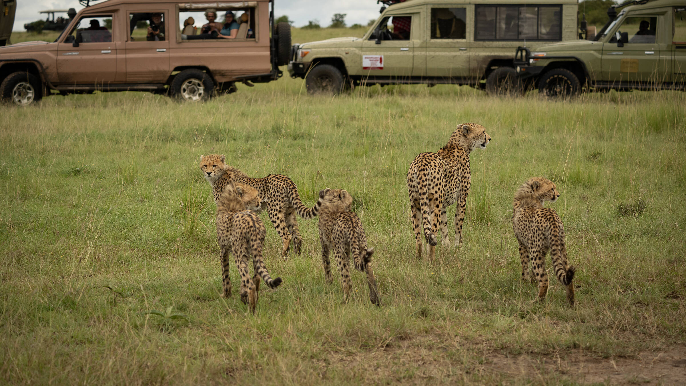En veldig fortellende situasjon med gepardfamilien som er omringet av safarikjøretøyer. Her kunne jeg ønsket å se mer av safarikjøretøyene og sirkuset som omgir dem.
