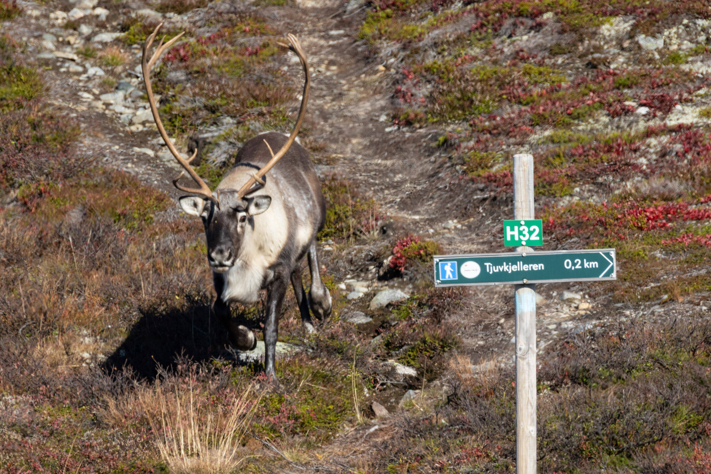 Morsom situasjon og en skikkelig kontrast mellom den sky villreinen den merkede turstien. En litt strammere komposisjon og bedre teknisk kvalitet kunne løftet bildet enda et hakk.