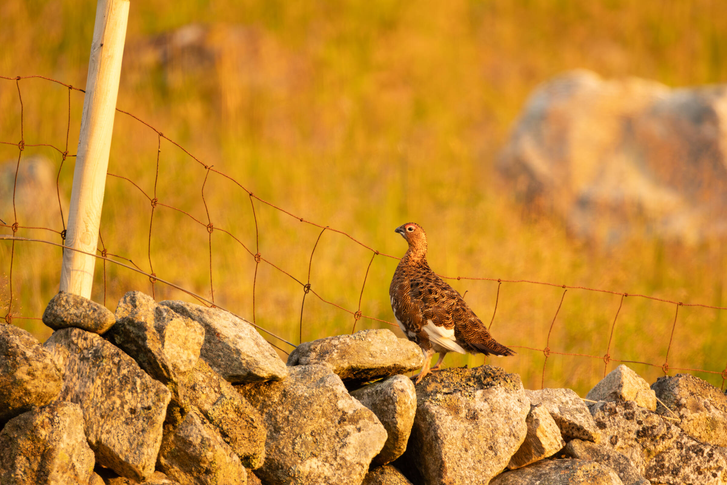 Fint lys og komposisjon med den sårbare rypa mot det brutale gjerdet. Mange ville kanskje tatt bildet slik at man unngår at gjerdet kommer med, men i dette tilfellet utgjør det et tydelig menneskelig element.