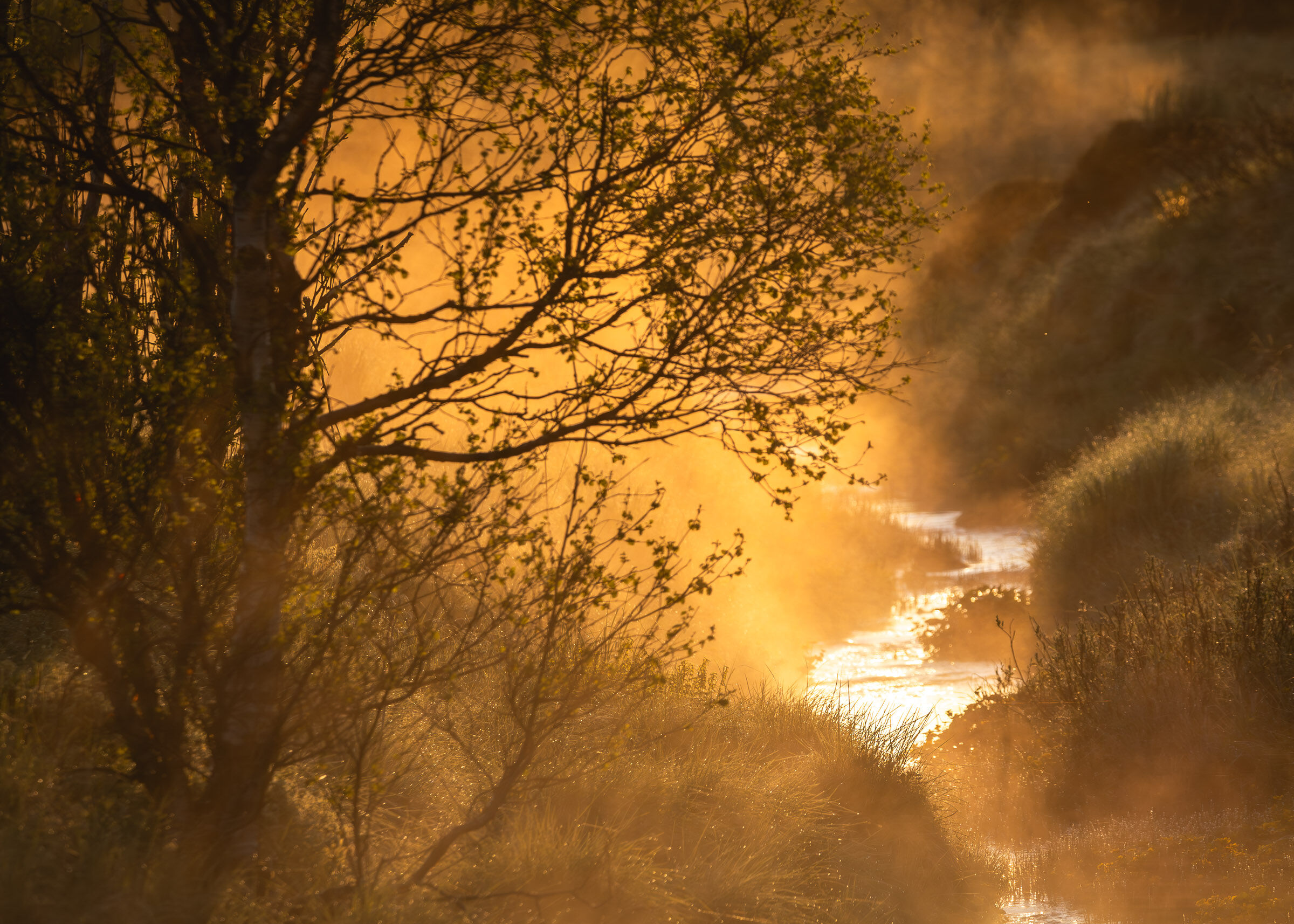 Ett trolskt landskap med gyllne morgonljus där vattnet leder blicken in i bilden och trädet på vänstra sidan är bra placerad. Man ser även daggdropparna i gräset.
