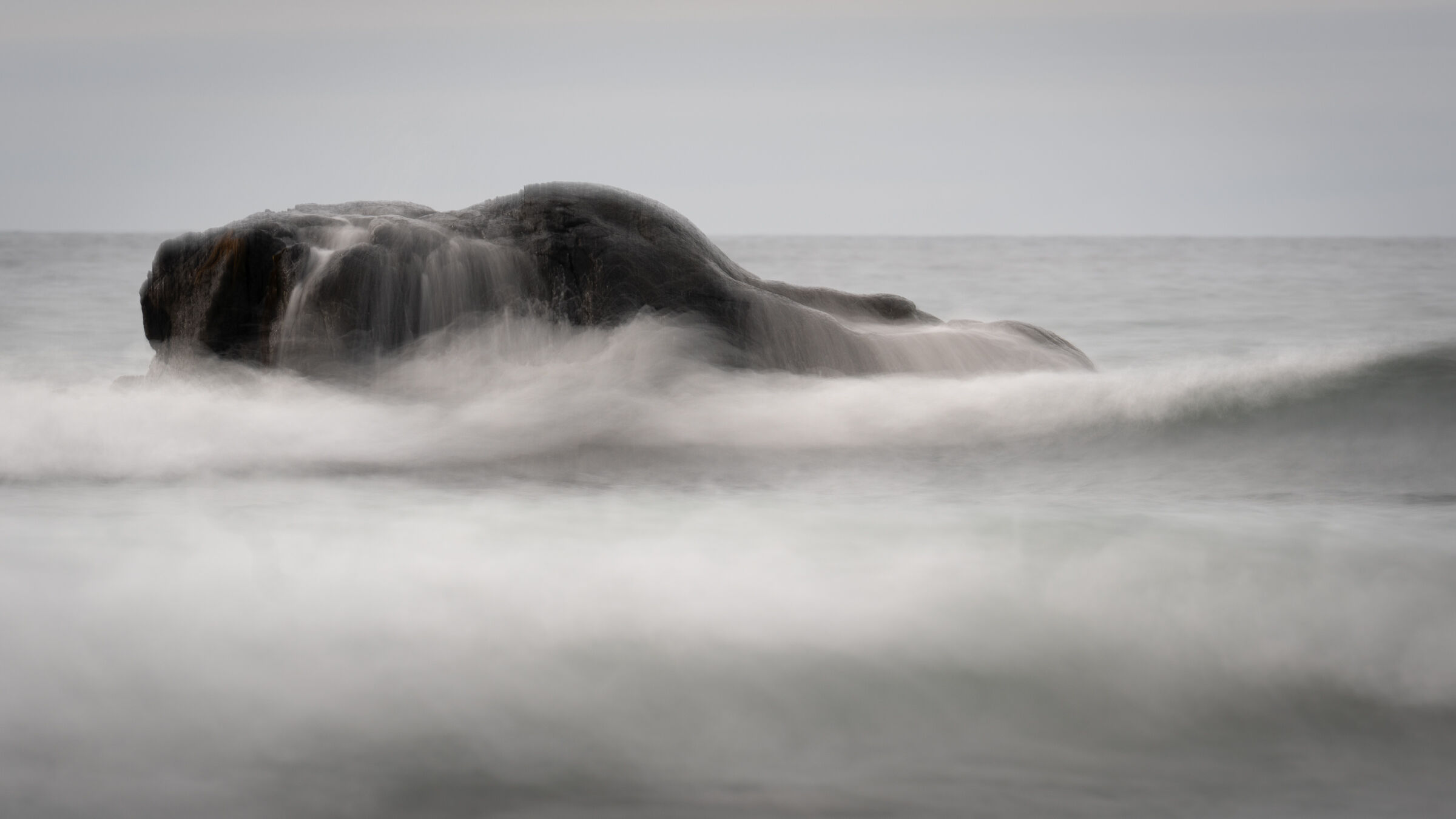 Jätten som ligger i havet skapar ett lugn i det kaoset vågorna skapar. Bra slutartid som fryst vågornas rörelse precis lagom. Lugn färgsättning. |