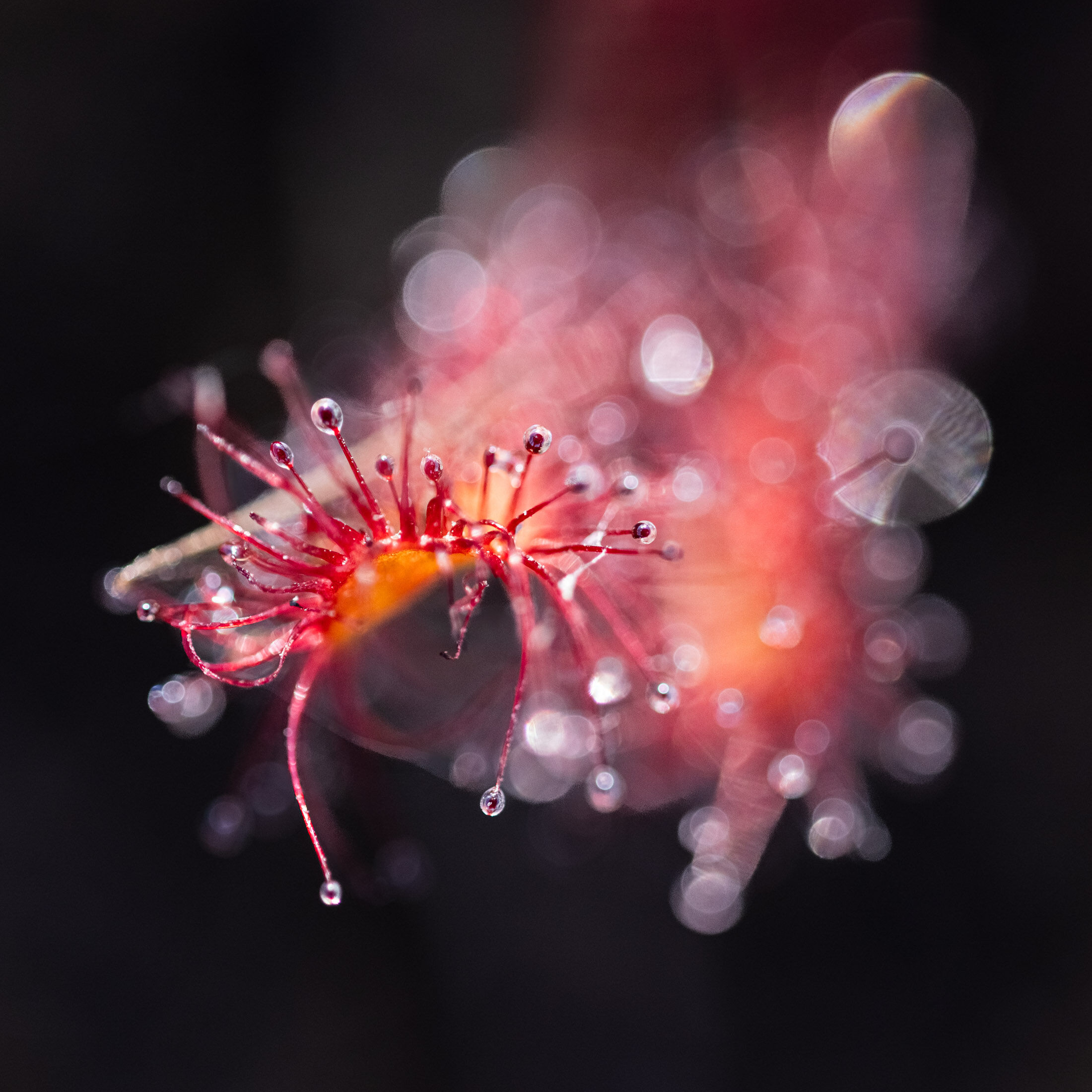 Fantastisk fint med dråpene oppover langs stilk og blomst; dråper over hele linja. Spennende komposisjon med sterk bruk av venstre side, og med stor, tom bildeflate i høyre side som fremhever hovedmotivet. Vågalt av fotografen.