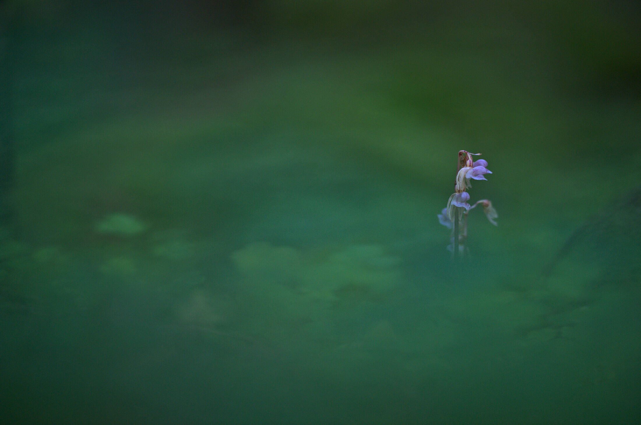 Stemningsfullt og flott bilde av en sjelden blomst. God bakgrunn som fremhever motivet. Fine refleksjoner i bakgrunnen - bidrar til god dybde. Orkideen, som vokser på mørke steder, kommer godt frem pga. dette.