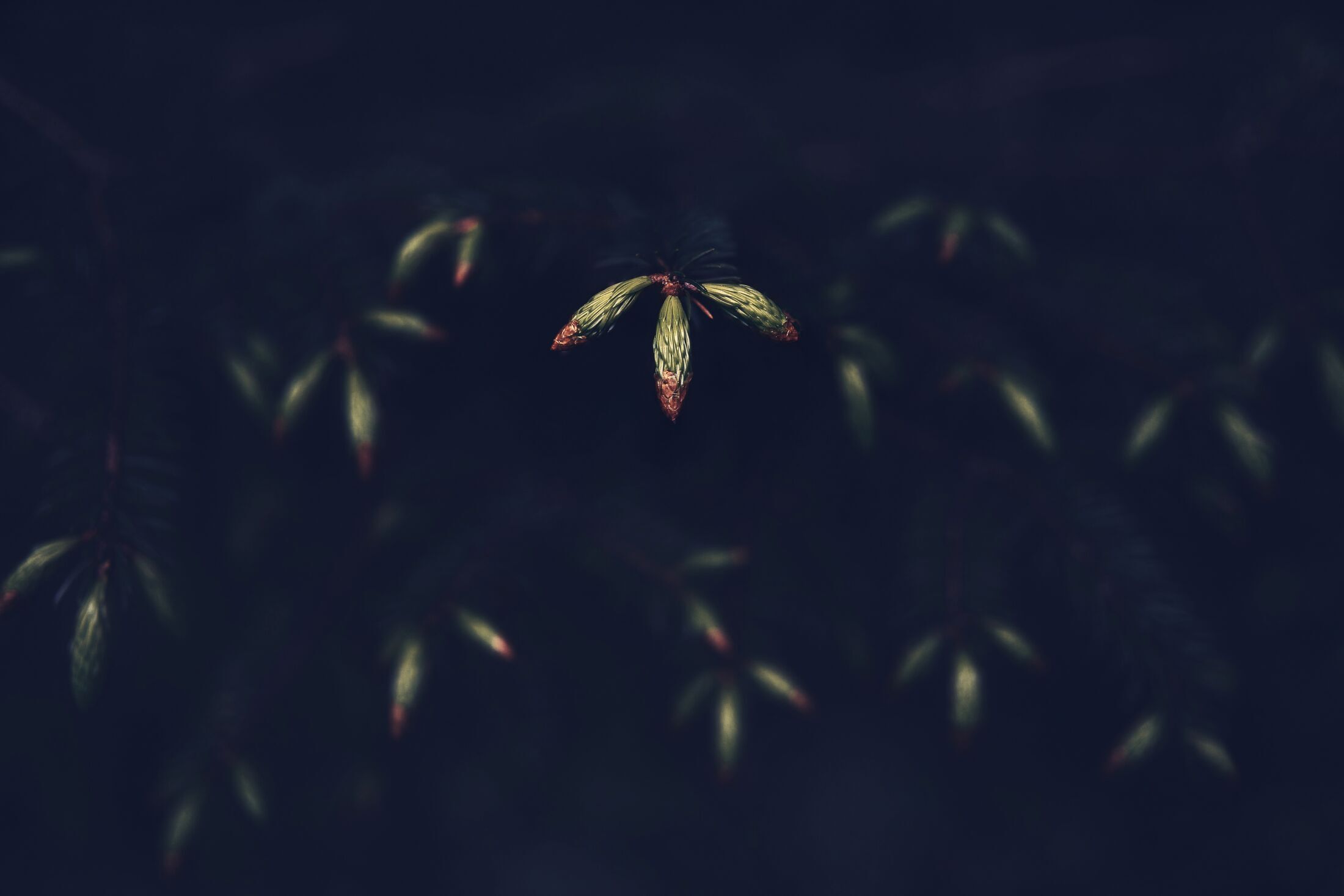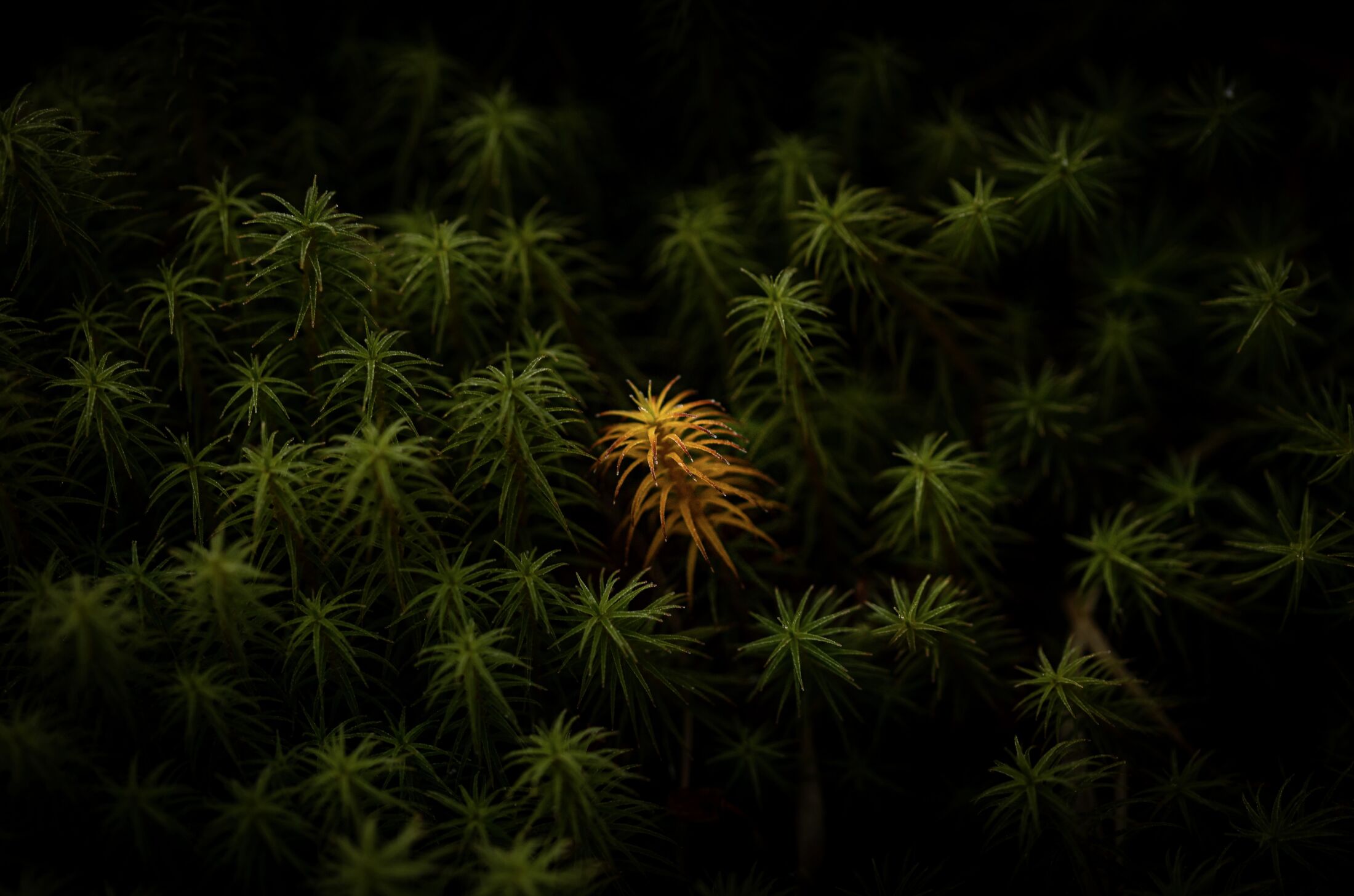 Svært spennende og uvanlig fremstilling av granskudd hvor fokus fremheves av mørket omkring. Stemningsfullt bilde som får frem den gode følelsen av å være del av skogen. Fine, duse farger som kler motivet.