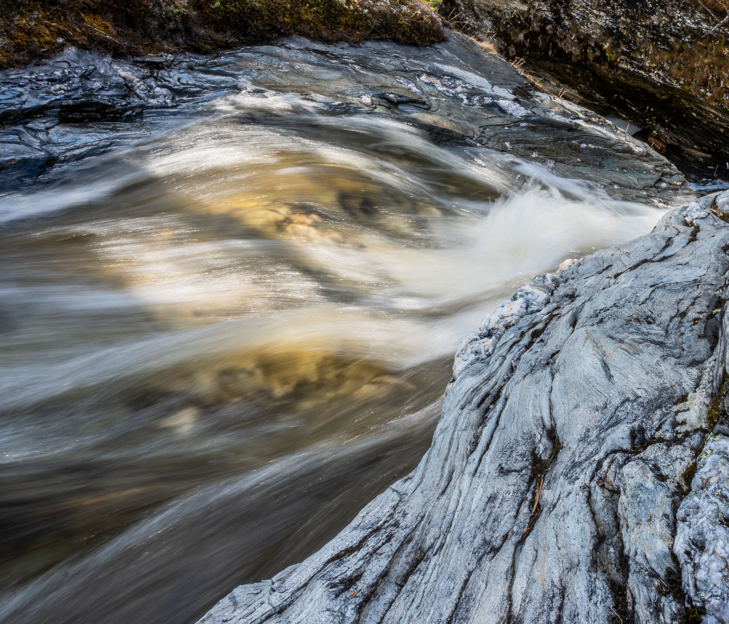Flomstor bekk i gammelskog |