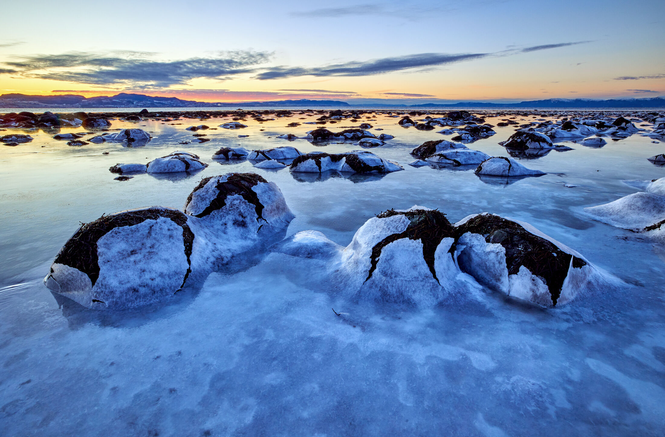 Den blå time etter en iskald dag ved kysten |