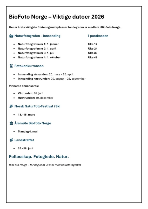 Nasjonalt, Nyheter Fra Styret25/01/2026<25/01/2026Viktige datoer 2026 by Anja Paixao Under kommer viktige datoer for BioFoto 2026, så medlemmene våre lettere kan ha oversikt over alt som skjer.